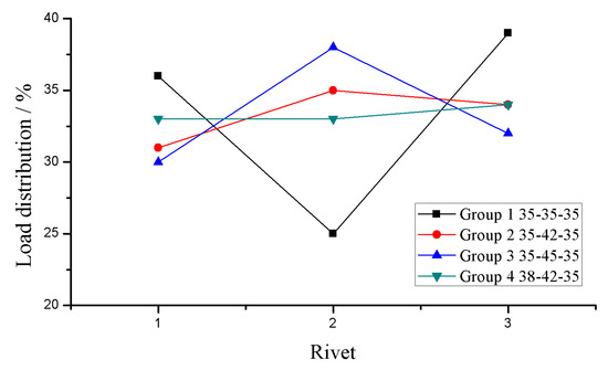 Figure 9. In Group 2 and Group 3, Rivet 2# and Rivet 3# carry the vast majority of tensile load. Tensile load transfers part by part will become harder when load distribution condition become more inhomogeneous.