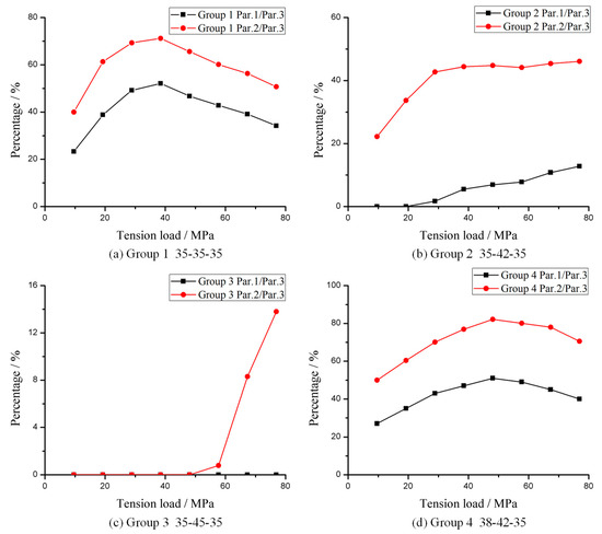 Obviously, in Group 2, the tensile load gradually transfers to Part I until the tensile load exceeds 20 MPa. When the tensile load is smaller than 20 MPa, strain