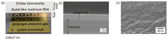 Figure 1 shows a photograph and scanning electron microscopy (SEM) images of an O3MeOT film coated on a glass substrate. The surface of the film depicts the reflected images of letters and rulers placed perpendicular to the film, indicating the specular reflection property. The reflection spectrum of the bar-coated film of O3MeOT in the present study (Supplementary Figure S1) agrees in intensity and shape with the previously reported reflection spectrum of the drop-cast film [11,12,13]. Therefore, these two films are considered to be optically identical. In the SEM image of the cross-section of the film (Figure 1b) and its partially enlarged image (Figure 1c), no layered or lattice submicron structure causing light interference or submicron structure causing Tyndall scattering was observed. These observations reduced the possibility that structural color is the origin of the film gloss.