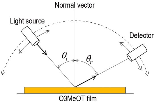 Subsequently, the possibility of the origin of a structural color was examined from the spectroscopic perspective. Figure 2 presents the schematic of a goniometric system for measuring spectral reflectance. The incident light angles, θi, with respect to the normal of the film surface, were 15°, 30°, 45°, 60°, and 75°. The detection angle θr of the reflected light was set in the range of −80° to 80° at 5° intervals. The O3MeOT film is considered to have a strong specular reflection component based on the results in Figure 1a, therefore, the measurements were performed at 1° intervals in the range of 10° before and after the specular reflection angle. In these measurements, a barium sulfate plate was used as the reference material, and thus the measured reflection intensity of the O3MeOT film is the relative reflection intensity to that of barium sulfate.