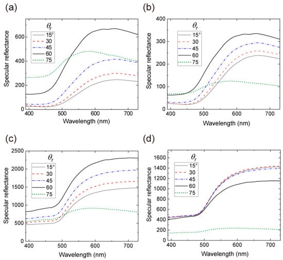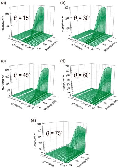 Figure 3 depicts the θi and θr dependences of the reflection spectra of the O3MeOT film. First, θi was fixed and the specular reflection spectra were recorded while θr was changed. Then, θi was changed and the spectra were measured in the same way to obtain the spectra shown in Figure 3. For any incidence angle θi, the reflectance was maximum when the relationship θi = θr was satisfied (i.e., specular reflection condition), and no light reflection occurred in cases where θr > θi + 2° or θr < θi − 2°. For each incidence angle θi, the reflection spectra satisfying θi = θr (i.e., the specular reflection spectra) were extracted from Figure 3 and compared as shown in Figure 4a. Assuming that barium sulfate is a perfect reflecting diffuser, according to Lambert’s cosine law [20], the luminous intensity Iθr of the reflected light from the barium sulfate surface at θr is given by Equation (1).