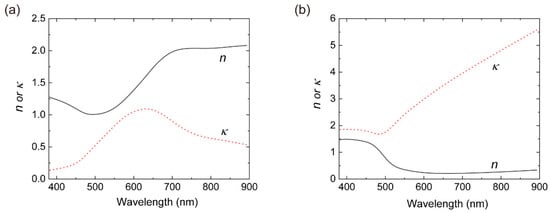 The refractive index (n) spectra and extinction coefficient (κ) spectra of the O3MeOT and vacuum-evaporated gold films obtained by ellipsometry are shown in Figure 5. The peak position of the refractive index spectrum of the O3MeOT film was located at a longer wavelength than the peak position of the corresponding extinction coefficient spectrum. This is due to the wavelength dispersion of the collective velocity of light in typical dielectrics [31]. As shown in Equation (2), the specular reflectance (R) depends on n and κ, and the R value is positively correlated with both n and κ [11,13,14,27].