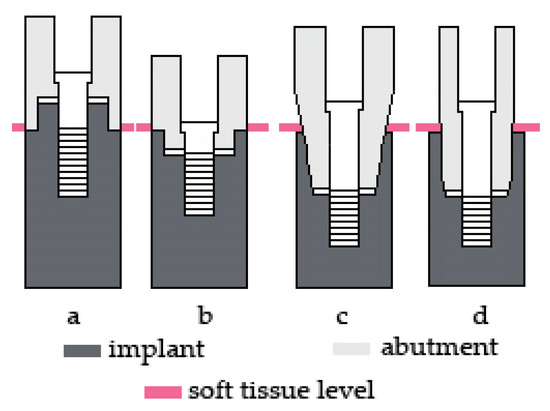 The emergence profile of implants is an important issue to facilitate favourable aesthetic outcome and maintain peri-implant health. The over-contoured prosthetic abutments causes an initial pressure on interproximal papilla, which leads to ischemia and, in consequence, to bone loss and apical migration of soft tissues [115]. However, a too small abutment in width may lead to an increased plaque and bacteria accumulation [123]. It has been proven, that there is an increased bone loss with convex abutment profile in comparison with the concave profile [106]. The frequent removal of the abutment causes apical migration of soft tissues [124]. Mechanical trauma to soft tissue leads to subsequent bone loss and low soft tissue profile [125]. The platform-switching type of implant-abutment connection influences the emergence profile. Thanks to this concept, the excessive pressure of the abutment on soft tissues can be eliminated. Moreover, it allows for maintaining proper hygiene around implant-supported restoration. A lower number of bacteria has been found at the implant-abutment interface when platform-switching was used, ensuring healthy soft tissues with a proper emergence profile around implants [126,127].