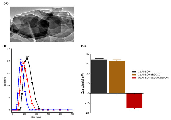 (A) TEM images of as-synthesized CuAl-LDH (scale bar 100 μm), (B) zeta size of (a) CuAl-LDH, (b) CuAl-LDH@DOX, and (c) CuAl-LDH@DOX@PDA, and (C) zeta potential of CuAl-LDH, CuAl-LDH@DOX, and CuAl-LDH@DOX@PDA.