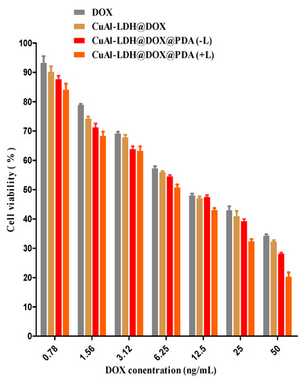 The in vitro therapeutic efficacy of NC was verified using methyl thiazolyl tetrazolium (MTT) assay in cells treated with DOX, CuAl-LDH@DOX, and CuAl-LDH@DOX@PDA with and without light at different drug concentrations. As seen in Figure 5. CuAl-LDH@DOX@PDA displayed better cytotoxic effects than DOX and CuAl-LDH@DOX at all the tested concentrations. In addition, light irradiation significantly reduced the number of viable cells (IC 50 12.5 ng/mL for DOX, CuAl-LDH@DOX, and CuAl-LDH@DOX (−L), 6.25 ng/mL for CuAl-LDH@DOX (+L)) in CuAl-LDH@DOX@PDA treated samples conforming to chemo-photothermal synergistic properties of the NC similar to previous findings.