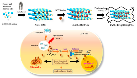 Cancer is the leading cause of death worldwide [1]. Several approaches have been developed for the management of cancers, including chemotherapy (CT), CDT, PTT, photodynamic therapy (PDT), photothermal therapy, radiotherapy (RT), and surgical therapy [2]. However, the use of a single therapeutic modality for cancer treatment is often associated with limitations such as minimal therapeutic efficacy, toxicity, reoccurrence of the malignancy, and resistance to a particular type of treatment [3]. To overcome these limitations associated with monotherapy, synergistic treatment modalities combining different treatments have evolved and have proven to be advantageous [4]. In recent years, the synergistic effects of CDT and PTT have been proven to be beneficial in the suppression of cancers [5,6]. NC-based therapeutic delivery has gained widespread attention recently due to the benefits such as site-specific drug delivery, targeted drug delivery, bio-imaging, cancer therapy, and applications in other bio-logical fields [7,8,9]. Various types of NC were used for biological applications such as mesoporous silica, polymeric NC, carbon nanotubes, lipid-based NCs, and LDH [10]. Among the NCs studied, LDH has versatile characteristics, such as adjustable elemental composition, good biocompatibility, and high interlayer gallery space facilitating a high drug loading capacity. Previous in vivo studies have confirmed that LDH NCs are non-toxic to animals without any signs of inflammation, blood obstruction, and histological changes after four weeks of treatment [11,12,13,14].