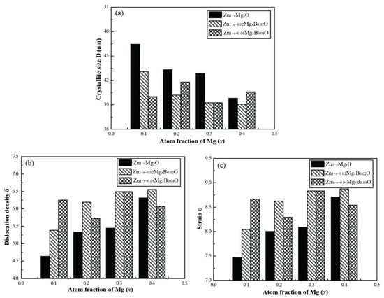 Comparison of calculated parameters of Zn1−x−yMgxByO with different fraction of Mg. (a) crystallite size D; (b) dislocation density; (c) strain.