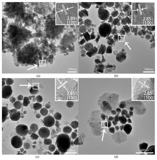 The typical transmission electronic microscopy (TEM) images of pure ZnO, Zn0.7Mg0.3O, Zn0.68Mg0.3B0.02O, and Zn0.66Mg0.3B0.04O nanoparticles are presented in Figure 4. Pure ZnO nanoparticles with an average particle size of 20–50 nm are agglomerated. The well-resolved interfringe distance of 2.89 Å corresponds to the (100) lattice planes of ZnO. In the Zn0.7Mg0.3O sample, discal-shaped particles showing good crystallinity are observed, which is consistent with the SEM results. After doping B ions, only spherical structures are present in Figure 4c,d. In addition, the lattice resolved images in Figure 4b–d all show that the lattice spacing is 2.85 Å, which can correspond to the (100) plane of ZnO, confirming that B-Mg co-doping did not change the structure of wurtzite zinc oxide.
