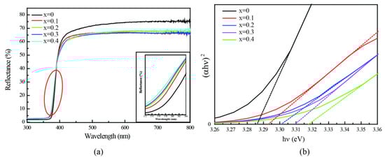 (a) UV reflectance spectra of Zn1−xMgxO nanoparticles; the inset is the enlarged figure in the red circle; (b) Tauc plots for determination of optical band gap energy of Zn1−xMgxO nanoparticles.