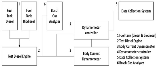 Figure 1 shows the schematic view of the experimental test setup, which included a single-cylinder, four stroke, direct injection diesel engine. The details of the test engine (Kubota RT 125, Kubota, Osaka, Japan) are presented in Table 1. Figure 2 indicates the experimental setup, which included an eddy current dynamometer to alter or tune the engine load. For this experimental test setup, a generator-type dynamometer was included to hold the engine load and speed. The function of the eddy current dynamometer is to provide brake power [21]. Besides that, this experimental test setup was also equipped with a data acquisition system to collect data and analyze the performance of the tested fuels according to various types of piston coatings. The injection system used for this experiment was a direct injection combustion system (KUBOTA RT125DI-ES, Kubota, Osaka, Japan) and the details are shown in Table 1. Besides, the coating on the piston was a 400 µm thick thermal barrier coating with an 100 µm lining layer of NiCrAl [13].