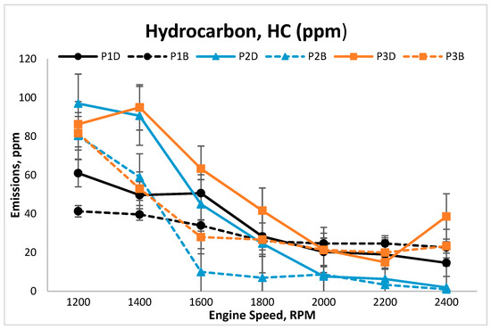 Figure 8 presents the trend of hydrocarbon emissions at the variable speed for coated and uncoated pistons. The results indicated that YSZ (P2D and P2B) yielded the lowest hydrocarbon emissions, followed by Al2O3·SiO2 (P3D and P3B) and, lastly, uncoated piston (P1D and P1B). These results were found to be similar to the reported results of several prior studies [24,25,26]. Basically, the combustion chamber and piston head in a standard engine generated lesser heat compared to the use of coated piston; thus, it affects the evaporation capability of the tested fuels. The YSZ-coated engine recorded a better fuel evaporation rate due to the increased temperature in the combustion chamber and coated piston crown. The higher combustion temperature due to the thermal barrier coating makes fuel burning easier and effective [27]. Besides that, the thermal barrier coating initiated a faster rate of breaking hydrocarbon into hydrogen and oxygen, then mixed with an excess of oxygen available in the combustion chamber, therefore lowered emission of hydrocarbons were recorded for coated piston [24]. Other factors, such as quenching distance or flammability limit, also should be included when discussing reduction of hydrocarbon emissions when applying a thermal barrier coating [28]. In addition, B100 palm biodiesel was found to yield lower hydrocarbon emissions compared to the conventional diesel. At the maximum load of 1200 rpm, P1D recorded the lowest hydrocarbon emission (61 ppm), followed by P3D (86 ppm) and P2D (97 ppm). As for the engine operation with biodiesel, P1B recorded the lowest hydrocarbon emission (41 ppm), followed by P3B (82 ppm), and P2B (92 ppm). Biodiesel enhances oxygen content, resulting in better combustion and, subsequently, lower hydrocarbon emissions [29,30]. The obtained results also revealed that P3D and P3B yielded lower hydrocarbon content, followed by P1D, P2B, P1B, and P2D, at the maximum speed of 2400 rpm. Referring to the decreasing trend of hydrocarbon emissions with increasing speed in Figure 8, the study proved that the increase of speed does affect the hydrocarbon emissions.