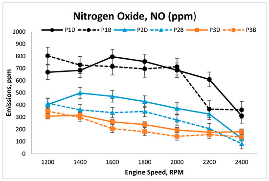 For all uncoated and coated pistons in the case of diesel, P3D recorded the lowest NO emission (307 ppm), followed by P2D (403 ppm), and P1D (669 ppm). Meanwhile, as for the case of biodiesel, P3B recorded the lowest NO emission (349 ppm), followed by P2B (414 ppm), and P1B (803 ppm). Overall, the use of biodiesel was found to perform better in reducing NO emissions as compared to the use of diesel. Additionally, P3D and P3B were found to maintain good stability and release the lowest NO emissions for both tested fuels across all engine speed settings. These findings proved that the impact of the thermal barrier coating in reducing NOx emissions, one environmental pollution source that should be controlled [31].