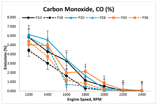 Figure 11 depicts the trend of CO emission at the variable speeds for coated and uncoated pistons. At lower speeds, the coated pistons emitted higher CO compared to the uncoated piston due to the lack of oxidation, lower temperature, and longer settling time. The production of CO decreased with the increase of speed, whereas the CO emission was suppressed to its minimum when the engine was at its optimum speed. At the maximum load, in the case of diesel, P3D recorded the lowest CO emission (5.03%), followed by P1D (5.82%), and P2D (6.13%). Meanwhile, in the case of biodiesel, P1B recorded the lowest CO emission (4.42%), followed by P3B (5.38%), and P2B (5.84%). Overall, the use of biodiesel was found to emit lower amounts of CO, as compared to the use of diesel.