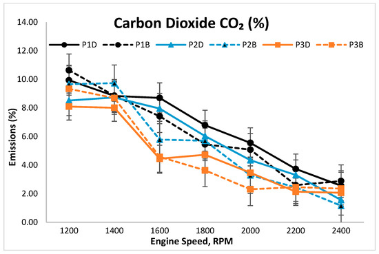 Figure 12 depicts the trend of CO2 emissions at the variable speeds for coated and uncoated pistons. At the maximum load, for all coated pistons in the case of diesel, P3D recorded the lowest CO2 emission (8.10%), followed by P2D (8.52%) and P1D (9.94%). On the other hand, in the case of biodiesel, P3B recorded the lowest CO2 emission (9.34%), followed by P2B (9.67%) and P1B (10.64%). Overall, the use of biodiesel yielded lower CO2 emissions compared to the use of diesel. Furthermore, both P3D and P3B were found to maintain good stability and released the lowest CO2 emissions for both tested fuels. Adding to that, the results also illustrated the effectiveness of the engine in achieving almost complete combustion for both tested fuels. Thus, as shown in Figure 12, the use of diesel contributes to higher CO2 emission, as compared to the use of biodiesel.