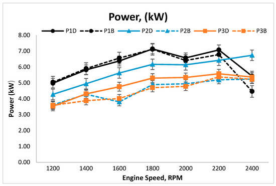At the maximum load, in the case of diesel, P1D recorded the highest power (4.98 kW), followed by P2D (4.28 kW) and P3D (3.53 kW). Meanwhile, in the case of biodiesel, P1B recorded the highest power (5.05 kW), followed by P2B (3.62 kW) and P3B (3.59 kW). Overall, the use of biodiesel was found to produce less power than the use of diesel (as baseline). Similar results were reported in prior studies, where the use of biodiesel generated less power than the use of diesel due to lower heating values and higher kinematic viscosity [34,37]. The results in Figure 14 also revealed the significant impact of coating in increasing power towards the increase of speed, as at 2400 rpm, P1B recorded the lower power than P2B and P3B. Similar results were also reported in another earlier study, which subsequently reaffirmed this observation [35].