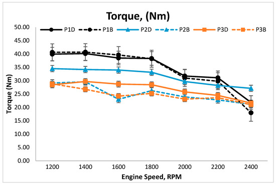 The engine performance is another important criterion when it comes to the internal combustion engine. As presented in Figure 14, the use of biodiesel recorded lower common trends as compared to the use of diesel (as baseline) for both coated and uncoated pistons. Similar results were also reported in several prior studies [37]. This observation can be explained by the combined effect of the relatively higher viscosity and lower caloric value in palm oil biodiesel, as compared to the conventional diesel [38]. At the maximum load, in the case of coated pistons in diesel, P1D recorded the highest torque effect (39.94 Nm), followed by P2D (34.51 Nm) and, lastly, P3D (28.43 Nm). Meanwhile, in the case of biodiesel, P1B recorded the highest torque effect (40.61 Nm), followed by P2B (29.13 Nm) and P3B (28.80 Nm). As for the case of the uncoated piston, the use of biodiesel produced a higher torque effect as compared to the use of diesel. However, for the case of coated pistons, the YSZ-coated piston in biodiesel yielded a lower torque effect than the YSZ-coated piston in diesel, whereas a similar torque effect was produced for Al2O3·SiO2-coated pistons in both tested fuels. A decrease of torque effect for biodiesel was found in line with the observation of a prior study [38].