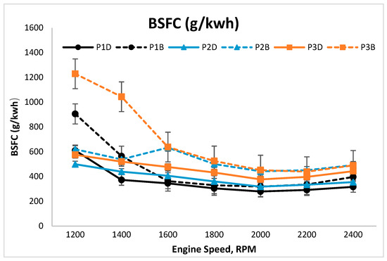 BTE and BSFC are other significant factors that determine the performance of an engine. In this study, BSFC was measured within the speed range of 1200 rpm to 2400 rpm for all coated and uncoated pistons under the operational conditions of both diesel and biodiesel. Figure 15 presents the results of BSFC at variable speeds. At the maximum load, in the case of diesel, P2D recorded the lowest BSFC (498.96 g/kWh), followed by P3D (575.16 g/kWh) and, lastly, P1D (609.98 g/kWh). Meanwhile, in the case of biodiesel, P2B recorded the lowest BSFC (619.81 g/kWh), followed by P1B (905.07 g/kWh) and P3B (1229.06 g/kWh). Specifically, in the case of diesel, the results in Figure 15 revealed a slightly higher value of BSFC, with the increase of speed for both YSZ- and Al2O3·SiO2-coated pistons, as compared to those of uncoated pistons (as baseline). The BSFC values of coated pistons were slightly different from the BSFC values of uncoated pistons. Furthermore, the BSFC for biodiesel was higher than the BSFC for diesel due to lower calorific values of palm oil biodiesel compared to conventional diesel [35]. The load on the engine increases with the decrease in speed. Thus, at the lowest speed of 1200 rpm, where the load was at its highest, both YSZ- and Al2O3·SiO2-coated pistons reported lower BSFC compared to the BSFC values of uncoated pistons. The temperature in the combustion chamber increased due to the application of a thermal barrier coating on the piston, which caused the fuel to evaporate easily, resulting in the reduction of BSFC [33]. A low BSFC value indicates that the combustion engine only needs low volume of fuel to produce similar performance to standard engine [27]. In addition, applications of coatings maintain high temperatures in the chamber, preventing heat loss to the surroundings [39].