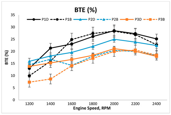 Figure 16 depicts the trend of BTE at the variable speeds for coated and uncoated pistons. Figure 16 shows a decreasing trend for BTE with the increase of speed for both YSZ- and Al2O3·SiO2-coated pistons, as compared to the uncoated pistons (as baseline). At the maximum load, in the case of diesel, P2D recorded the highest BTE (15.94%), followed by P3D (13.83%) and P1D (13.04%). Meanwhile, in the case of biodiesel, P2B recorded the highest BTE (14.55%), followed by P1B (9.97%) and P3B (7.34%). Overall, the use of biodiesel recorded lower BTE than the use of diesel, which may be attributed to the poor fuel atomization characteristics, higher flash point, and lower volatility [39,40,41]. The load on the engine increases when the speed decreases. As compared to the uncoated piston, YSZ- and Al2O3·SiO2-coated pistons recorded higher BTE. The BTE of uncoated piston reduces with the decrease of engine speed. At lower engine speeds, the output torque is the highest due to the higher amount of fuel injected per cycle, resulting in the generation of higher heat. Hence, YSZ- and Al2O3·SiO2-coated pistons in this study recorded higher BTE due to the increase of heat for the gas expansion. This may be attributed to better heat insulation and the staged combustion effect of the thermal barrier material that converts more heat into useful works.