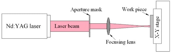 Shown in Figure 1 is a schematic layout of the apparatus used in the conduct of the laser cleaning experiment. The substrate material used as samples for the in-process monitoring investigation was titanium alloy (Ti6Al4V) with dimensions of 50 × 50 × 1 mm3. Some of the samples were contaminated with industrial machining coolant to study the effect of the contaminant on laser cleaning performance. The application procedure of the contaminant and its thickness were carefully controlled in all the samples in accordance with laid-down industrial procedures. The laser source used for the experiment was a frequency-tripled Litron Nd:YAG lamp-pumped laser with a wavelength of 355 nm, pulse duration of 8 ns, and maximum pulse frequency of 10 Hz. The laser beam was incident on an opening of 10 mm2, situated on a 1-mm thick object mask of a stainless-steel sheet, and then passed through a focusing lens of 200 mm focal length. The mask enabled the selection of a laser beam of uniform intensity from the frequency-tripled Nd:YAG laser. Careful control of the mask-to-lens and lens-to-target distance ensured the required laser spot size over the target surface. Four fluence levels of 0.4 J/cm2, 0.55 J/cm2, 0.7 J/cm2, and 0.85 J/cm2 were respectively considered in this study in order to understand the influence of laser fluence on the cleaning and monitoring characteristics.