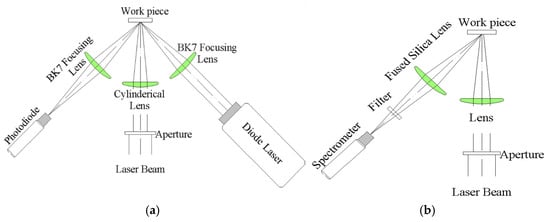 With respect to the integration of an in-process monitoring system to the laser cleaning system, schematic layouts of the experimental arrangement for the PBR and PES as integrated into the laser cleaning system are shown in Figure 2a,b, respectively.