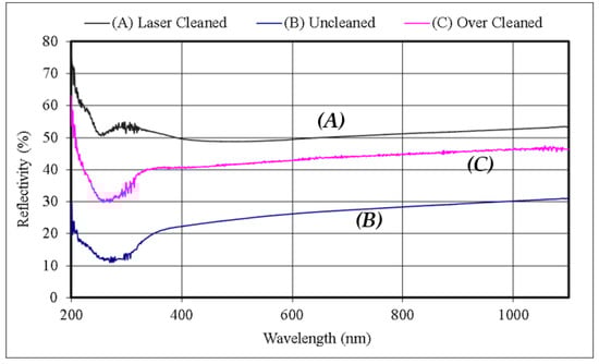 The PBR method monitors the intensity of the light source reflected from the substrate surface as an evaluation of the laser cleaning process. The variation in the intensity of the reflected light source during laser cleaning is calibrated and through which the process is monitored and controlled. Being based on measuring the reflectivity of the sample at a particular wavelength, the PBR method was carried out such that before the experiment the reflectivity of the laser-cleaned, uncleaned, and overcleaned samples were experimentally evaluated using a UV spectrophotometer and the results are shown in Figure 4.