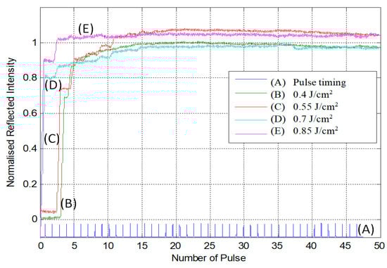 Effect of laser fluence on change in reflectivity of PBR with an increase in number of pulses for a stationary laser beam (beam size = 1 mm2, frequency = 10 Hz, monitoring laser wavelength = 635 nm).