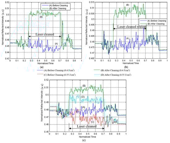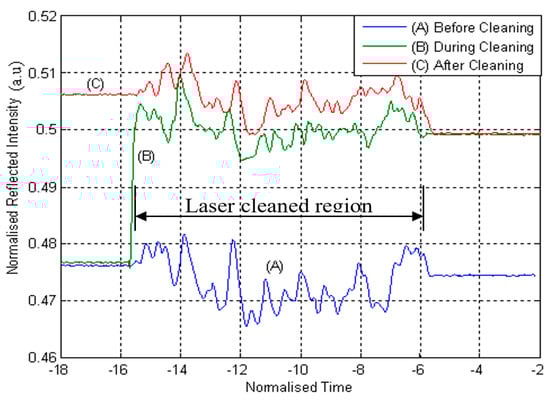 Details of the reflected intensity of the PBR system as recorded along the same line before, during, and after laser cleaning for a laser fluence of 0.55 J/cm2 and 20 pulses per position are presented in Figure 6, where a distinct difference in reflectivity of the workpiece before and after laser cleaning can be observed. This is an indication of the quality of cleaning of the substrate after the laser cleaning process. The figure also indicates that during laser cleaning the reflectivity increases sharply as the laser beam starts to clean the workpiece surface and maintain its level as the cleaning progresses.