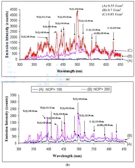 Emission spectra of titanium alloys for various laser fluences (a) Stationary beam (after 200 pulses, beam size = 1 mm2), (b) Moving beam (fluence = 0.85 J/cm2, beam size 1 mm2, lens focal length = 200 mm).