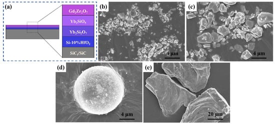 (a) Schematic diagram of T/EBCs coating structure. The SEM images of each coating powder of T/EBCs: (b) Si–HfO2; (c) Yb2Si2O7; (d) Yb2SiO5; (e) Gd2Zr2O7.