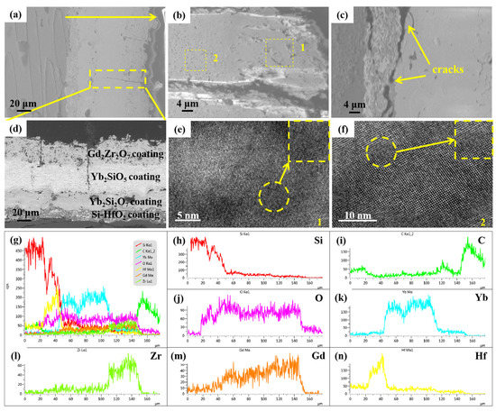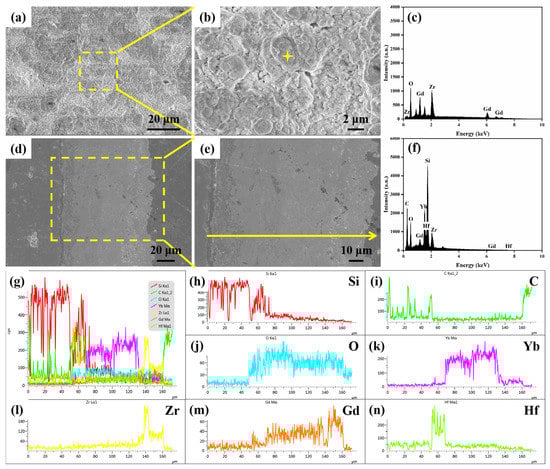 SEM images and EDS analysis of T/EBCs: (a) micromorphology of surface layer; (b) enlargement of (a); (c) point scan analysis; (d) micromorphology of cross-section; (e) enlargement of (d); (f) line scan analysis. Composition distribution of T/EBCS coatings cross section: (g) all elements; (h) Si; (i) C; (j) O; (k) Yb; (l) Zr; (m) Gd; (n) Hf.
