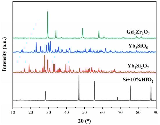 To further investigate the phase characteristics of each coating after PS-PVD spraying, the phase structure of the coating was analyzed by X-ray diffraction. Whenever the substrate is sprayed with a new coating, small angle X-ray scattering is used for interlayer phase analysis. The XRD pattern of each coating in the T/EBCS coatings is shown in Figure 3. The positions of the diffraction peaks of each coating are consistent with the characteristic peak positions of the Gd2Zr2O7 [12], Yb2SiO5 [13], Yb2Si2O7 [14], and Si–HfO2 [15] coatings, indicating that the coatings combined via physical stacking.