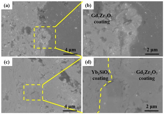 Cross-sectional micromorphology: (a) Gd2Zr2O7 coatings; (b) enlargement of (a); (c) Gd2Zr2O7/Yb2SiO5 interface; (d) enlargement of (c).