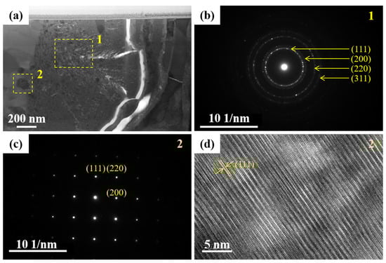 To better understand the microstructure of the Gd2Zr2O7 coating, the coating was characterized by TEM (Figure 6), with SAED patterns and HRTEM images. Figure 6a shows that the areas marked 1 and 2 in the bright field image are the Gd2Zr2O7 coating. The Gd2Zr2O7 coating is characterized by diffraction rings and diffraction spots, indicating that the coatings have polycrystalline and monocrystalline phase structures. Figure 6b shows the diffraction ring of the Gd2Zr2O7 coating, and the presence of the crystal face index (111) implies the ordered superlattice Gd2Zr2O7 pyrochlore structure [16]. Figure 6c shows the diffraction spots of the Gd2Zr2O7 coating. Crystal plane indices (111), (200), and (220) are mainly observed, which is consistent with the monocrystalline phase characteristics of the Gd2Zr2O7 coating [17]. Figure 6d is the HRTEM image of the Gd2Zr2O7 coating with defect-free structural features (no point or dislocation defects).