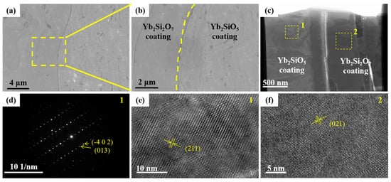Cross-section micromorphology: (a) Yb2SiO5/Yb2SiO7 interface; (b) enlargement of (a); TEM images: (c) bright field image of Yb2SiO5/Yb2SiO7 interface; (d) the SAED pattern of the areas marked 1 in (c); (e) HRTEM image of the areas marked 1 in (c); (f) HRTEM image of the areas marked 2 in (c).