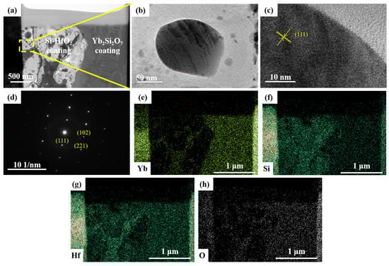 The structural characteristics and elemental distributions of the Yb2SiO7 and Si–HfO2 coatings closest to the SiCf/SiC CMC substrate were characterized by TEM and EDS. TEM and diffraction patterns of the Yb2SiO7/Si–HfO2 interface are shown in Figure 8. The interface between the dark-colored Yb2SiO7 coating and the light-colored Si–HfO2 coating is clear, and the binding is tight, without cracks. Figure 8b is an enlarged view of the light-colored Si–HfO2 coating. Nano-HfO2 particles are embedded in the light-colored Si coating. The HRTEM image and diffraction spot analysis of Figure 8c,d confirmed this observation [9,21]. Figure 8e–h shows the EDS patterns of the Yb2SiO7/Si–HfO2 interface. The right side is enriched with Yb and O, indicating that the Yb2SiO7 coating is on the right side. Si is enriched on the left side, indicating that the Si–HfO2 coating is on the left (Figure 8f). A small amount of interdiffusion of Yb and Si is observed at the coating interface [22].