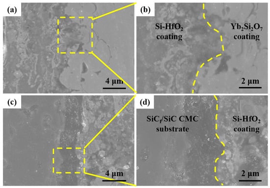 The interfacial boundary of Yb2SiO7/Si–HfO2 is irregular and clear (Figure 9a,b), which is consistent with the observations in Figure 8a. Figure 9c,d shows that the interface of the Si–HfO2 coatings and SiCf/SiC CMC substrate is bonded continuously, and no large holes or cracks are present, which indicates that the PS-PVD technology is able to deposit a dense Si–HfO2 coating on the CMC substrate. The PS-PVD technology is a hybrid coating method technology, which can prepare Si–HfO2 coatings by vapor or liquid deposition [9].