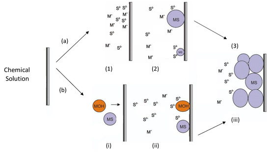 Figure 1b shows the cluster–cluster mechanism. In the first stage, colloidal size particles are generated in metal sulfide solution (e.g., ZnS or In2S3) or a possible intermediate (Zn(OH)2 or In(OH)3); then, these particles diffuse onto the substrate (Figure 1(bi)). In the second stage, the first nuclei are generated on the surface of the substrate (Figure 1(bii)). In the third stage, the nuclei grow by absorbing more Zn2+ and S2− ions, and the reaction continues until the possible intermediates transform into the respective sulfide through interchange reactions (Figure 1(biii)). Particle growth occurs both inside the solution and on the substrate surface. Finally, the particles adhere to each other on the surface of the substrate and form the film [41,42]. In the CBD process, both mechanisms may be present, generating the film and allowing the addition of colloidal aggregates for the subsequent growth of the film. The control of one of the two mechanisms is established by the extent of homogeneous and heterogeneous nucleation.