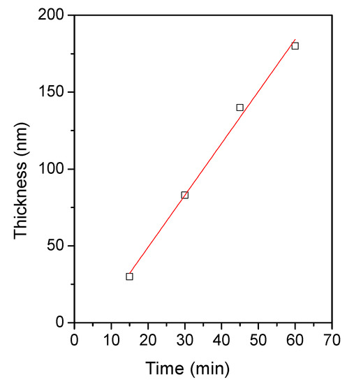 Figure 2 shows the Zn(O;OH)S thin-film thickness as a function of the deposition time. In the typical growth trend during CBD, two regions are distinguished: (a) linear growth, a stage in which the film thickness increases linearly with time, and (b) the saturation zone, a stage in which the growth rate decreases significantly as a consequence of consumption of the reagents inside the solution [43,44]. In our case, the data on thin film thickness within a 60 min time were suitable with linear fitting (R2 = 0.993); after this time, it is typical, in the CBD process, that linear kinetics change to due to the consumption of the reagents inside the solution. We performed the deposition of each layer within a 45-min deposition time (linear growth, Figure 2). Table 1 lists Zn(O;OH)S thin film thickness as a function of the number of layers. The results show a typical trend: as the number of layers increases, so does the thickness of the films. After the second layer, the coating thickness exceeds 100 nm. The typical thickness used to reduce the mechanical stress between the absorbent layer and the transparent conductor oxide (TCO) in thin-film solar cells is smaller than 100 nm. For three and four layers, the thickness values are 350 and 480 nm, respectively. The next sections will present the effect of the number of layers on the optical and structural thin films.