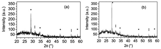 The thickness of the films was measured using a Veeco Dektak 150 profilometer (Plainview, NY, USA). The optical properties of the thin films were studied through transmittance measurements between 300 and 800 nm (Perkin Elmer Lambda 2S spectrophotometer, Waltham, MA, USA). The structural assay was carried out using a Shimadzu 6000 diffractometer (Tokyo, Japan) with a source of CuKα radiation (λ = 0.15418 nm) within the 2θ range of 20°–60°. Finally, the chemical surface assay was carried out using a Perkin-Elmer ESCA/SAM model 560 (Waltham, MA, USA).
