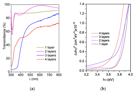 Figure 5a shows the transmittance curves of the Zn(O;OH)S films deposited on SLG by the CBD process. The number of layers significantly affected the spectral transmittance. In general, for one (90 nm) and two (190 nm) layers, transmittances are greater than 80% in the visible region of the electromagnetic spectrum (zone of low absorbance λ > 310 nm). Such a high transmittance value indicates that these coatings are optically suitable for use as a buffer layer. Furthermore, Figure 5a shows a deterioration in the optical transmittance for three and four layers, reducing until 60–70% (three layers) and 50–60% (four layers). High optical transmittance in the visible range of the electromagnetic spectrum is a critical requirement for buffer layers inside solar cells. The band-gap energy value was determined for all samples using the Tauc model. For films with reduced thickness and that do not present sufficient interference patterns, the absorption coefficient of each layer can be determined using the following equation [66,67]: