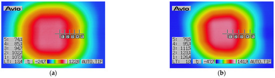 Heat distribution of the center point of 100 μm thickness at 15 min: (a) Coating plane; (b) SUS304 plane.