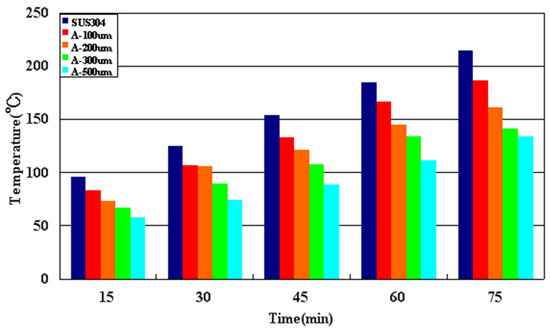 According to the analysis of the heat distribution, the temperature changes in the high temperature environment can be compared for the different thermal spray layer thicknesses of each composition. Firstly, the high-temperature thermal insulation performance analysis of A is given in Figure 6.