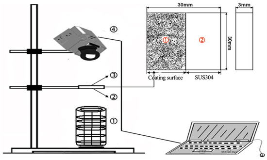 In this study, a heating device is used to heat the center of SUS304 with coating under greenhouse conditions. The heating temperature is about 300 to 400 °C. The flame apex is maintained 5 to 10 cm far from the center of the alloy. Heating continues for 75 min, and vertical photos are taken every 15 min by an infrared thermal instrument (TVS-700, NEC Corporation, Tokyo, Japan) to analyze the temperature changes of the points on the surface and the points on the coated surface based on the heat distribution map. Figure 2 is the schematic diagram of experiment equipment.