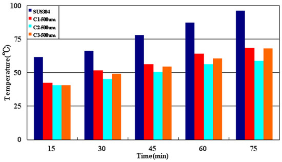 According to the analysis of the heat distribution, the temperature changes in the high temperature environment can be compared for the different thermal spray layer thicknesses of each composition. Firstly, the high-temperature thermal insulation performance analysis of C1 is given in Figure 6.