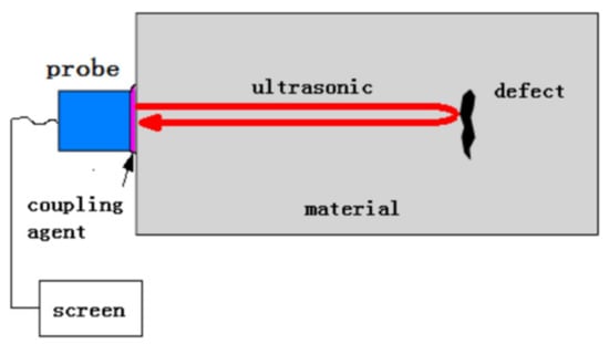 Ultrasonic testing (UT) is characterized by using the mechanical energy of ultrasonic waves to detect defects in composite materials [20]. The range of frequencies above the human hearing (0.5–20 MHz) is utilized in this technique. Such short wavelengths of these signals can travel through solid, liquid, and gas, making them the best choice for better local resolution [16,21]. Figure 1 illustrates the basic principles of ultrasonic testing. A voltage pulse is sent to the probe to generate an ultrasonic pulse in this arrangement, propagating into the inspected material through a coupling agent. Upon meeting any defect, partial reflection will occur. The reflection travels back through the same path to be received by the probe, converted to an electric signal and displayed on the screen. The position and size of the detected defects could be determined by analyzing the reflected pulses in terms of location and amplitude [14].