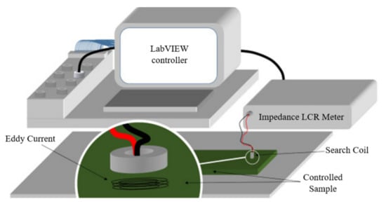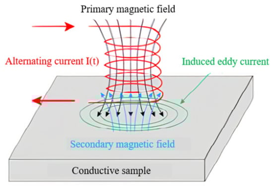 Eddy current testing (ECT) is a method that utilizes the theory of electromagnetic induction to inspect conductive composite materials [16,30]. By using a transmitter coil, a primary magnetic field is generated near the material under test. According to Faraday’s law, an eddy current will be induced in the material [31]. A secondary magnetic field will also be generated in the material to interact with the magnetic field generated by the coil, as shown in Figure 3. On the other hand, the schematic diagram of the ECT is shown in Figure 4.