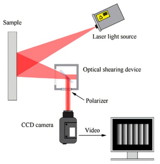 Laser shearography (LS) employs coherent and monochromatic laser light properties to illuminate the surface of the composite material under test. These properties will cause the reflected lights from the rough surfaces of the defected areas to generate a speckle pattern, which is captured by a camera [18]. Figure 5 shows an LS testing setup. The processing of the interferometry images is achieved by using two laser beams with the same wavelength. A charge-coupled device (CCD) video sensor captures the condition of the inspected sample. Consequently, the speckle pattern can be produced according to the inherent surface roughness of the material. Applying external load causes deformations in the inspected material’s surface, which will make the speckle pattern change. Employing a loading system, such as a vacuum, would emphasize the defects in the composite materials by applying surface vacuum stressing to the sample, which causes the effect of body “expansion” [27].
