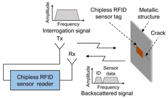 Basic principle of a chipless radio-frequency identification (RFID) sensor system for crack detection and characterization on a metallic structure [38].