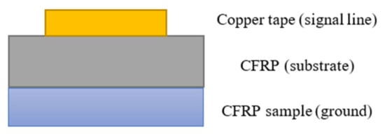 On the other hand, the composite could become a ground plane of a transmission line. Based on [51,52,53], a copper tape as a signal line is placed on the GFRP plate, which acts as a substrate, as shown in Figure 9. This constructed structure is known as the microstrip line under the category of the self-sensing method. The working principle of this method while inspecting the materials is based on changing characteristic impedance whenever any defects exist. According to the reflected signal, the existing defects could be located in the form of a time-domain known as time-domain reflectometry (TDR). As reported, several defects such as delamination lightning strike damage, matric cracks, and fiber breakage could be detected successfully via the aforementioned method. By referring to the testing setup in Figure 9, the dimensions of GFRP and CFRP were the same as both plates were glued together. The copper tape and CFRP that stuck to the GFRP were soldered to a coaxial cable at the end of the transmission line. Due to this scenario, this method does not apply to numerous practical applications since microstrip lines should be bounded to the sample under inspection.