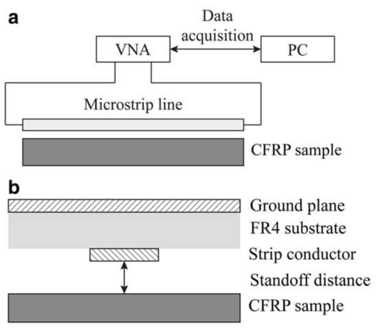 In addition, another work related to the self-sensing method, which is part of a transmission line according to the study conducted by [54]. An independent microstrip line was used on the printed circuit board (PCB) to detect the defects of the materials under inspection via the TDR concept. The detection system setup with a microstrip line sensor is shown in Figure 10. The strip conductor was placed near the surface of the CFRP sample. A new transmission line will be formed when a portion of the electromagnetic field was distributed between the strip conductor and the CFRP sample. The reported measuring system in [54] differs from the measuring system in [51,52,53], where it can be separated from the material under investigation. Moreover, according to the study conducted in [54], the size is smaller than the CFRP sample. Hence, the whole area of the material could be examined by conducting a line scan. A microstrip line was made on the FR4 substrate during testing with a standoff distance of 100 µm. The vector network analyzer (VNA) will generate the microwave signal transmitted towards the material under inspection. After that, time-domain data were obtained from the frequency domain data via the inverse fast Fourier transform (IFFT) [55]. According to the data obtained, the detected defects on the material were represented by the peak in the curve. Whenever there is a defect, the magnitude of the curve at a specific location will be higher than other locations to form a peak.